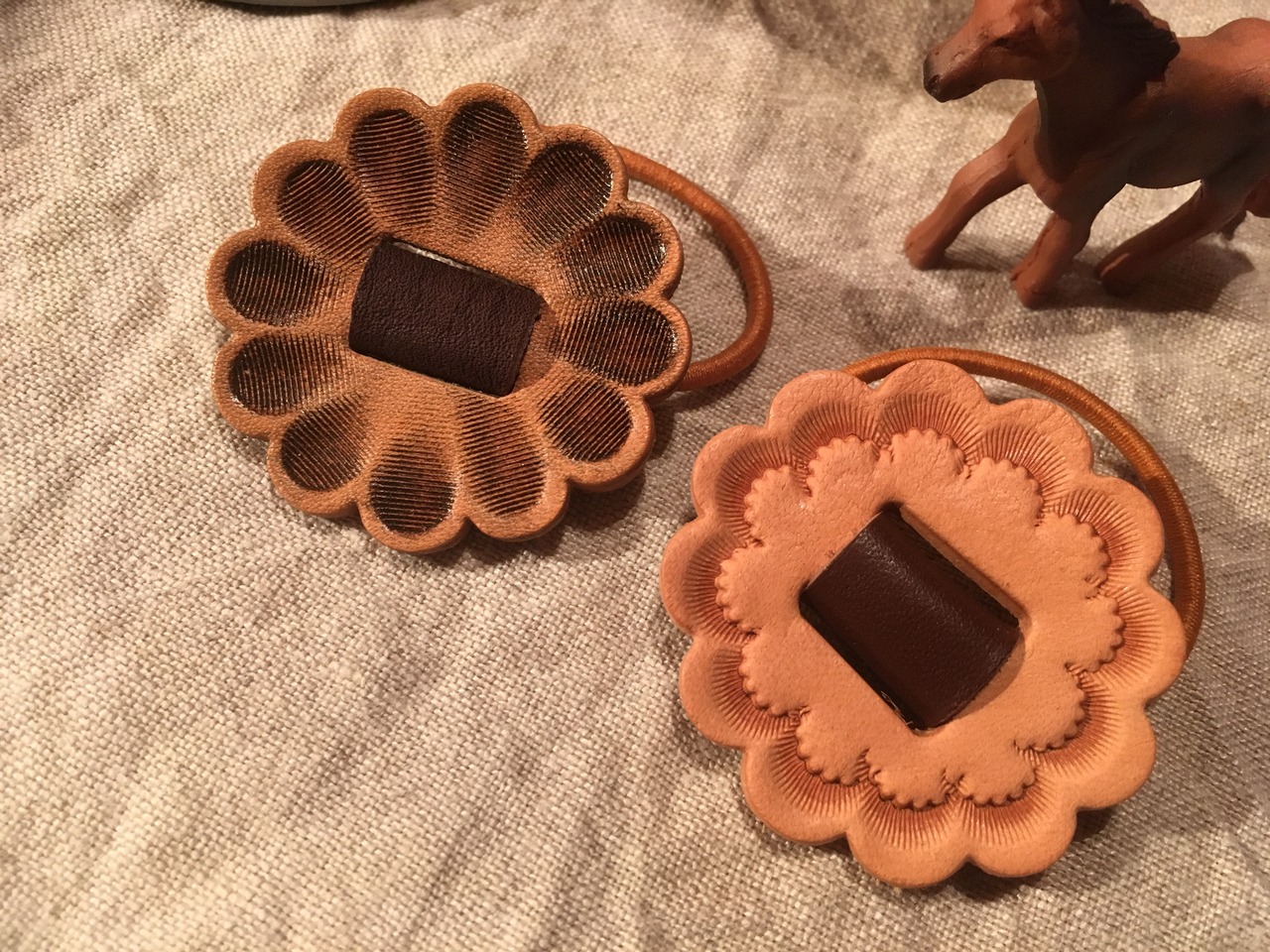 お花の中心(留部分)の革は馬革やバッファローレザー等使用しています